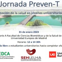 La Sociedad española de Hipertensión, con la participación de nuestra Sociedad, ha reanudado las conferencias y talleres de promoción de la salud entre estudiantes universitarios que forman el Programa PrevenT. Esta vez, el evento ha reunido a una cincuentena de participantes en la Universidad Europea de Madrid que pudieron asistir a las diferentes conferencias el Programa PrevenT. Lectura crítica de etiquetas de alimentos. ¿Cómo lo hago? Dª. Andrea Calderón. Departamento de Enfermería y Nutrición. Universidad Europea de Madrid. Mindfulness. Entrenando emociones y pensamientos: el deporte emocional. Dª. Fernanda Páez-Bravo. Psicóloga Clínica. Madrid ¿Por qué cuidarme si no me duele nada? Dr. José Antonio García Donaire. Unidad de HTA. Hospital Clínico San Carlos. Madrid ¿Cómo afecta el sobrepeso a mi salud? Prof. Jesús Román Martínez. Sociedad española de Dietética ¿Te han dicho que tienes que controlar tus emociones para dirigir mejor tu vida? Dª. Vanessa Abrines Bendayán. Psicóloga Clínica. Director de VAB & Asociados. Madrid Promoción de la salud desde la radio. Dr. José Miguel Mansilla Domínguez. Departamento de Enfermería y Nutrición. Universidad Europea de Madrid. Imágenes de los conferenciantes en el auditorio de la Universidad Europea.