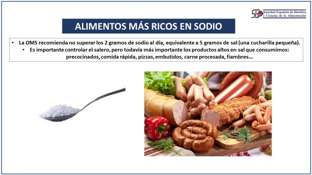 En general, no más de un 10-20% de nuestro consumo de sodio procede del sodio naturalmente presente en los alimentos. Si nos excedemos en el consumo de sodio será por usar el salero más de lo necesario y sobre todo, por el consumo de productos procesados altos en sal. Es importante comprobar en la tabla de composición nutricional del etiquetado el aporte de sal y procurar optar por productos que contengan <1g de sal/100g de producto, o aquellos que contengan la alegación nutricional «Bajo en sal´´.