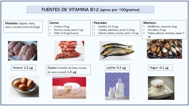 La vitamina B12 es una vitamina hidrosoluble que se encuentra únicamente en alimentos de origen animal. Pese a que es comúnmente conocido que también pueden contenerla algunas algas, muchas de ellas lo que realmente contienen son análogos de la vitamina B12 conocidos como corrinoides, que además de no ser activos ni útiles como vitamina B12, puede enmascarar una posible deficiencia de esta vitamina en una analítica sanguínea si abusamos del consumo de algas. Otras algas contienen pequeñas cantidades según algunos estudios, pero apenas son representativos y menos en nuestra dieta. De todas formas, su deficiencia es muy improbable en nuestra alimentación habitual siempre que consumamos alimentos de origen animal.