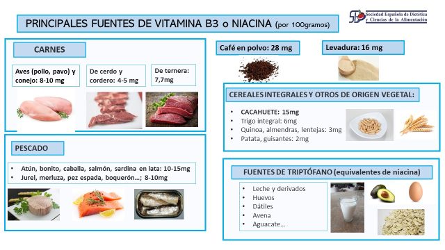A partir de nuestra alimentación podemos obtener el total de la vitamina B3 activa que necesitamos directamente. Proviene de multitud de grupos de alimentos: pescados, carne, frutos secos, cereales, legumbres…
