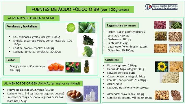 Su nombre procede de folium que significa hoja, y la encontramos principalmente en vegetales de hoja verde. Una dieta rica en verduras y hortalizas, recomendándose su presencia en cada comida y cada cena, y piezas de fruta enteras, asegura su consumo en población sana. También se encuentra en semillas y leguminosas, algunos alimentos de origen animal y cereales.