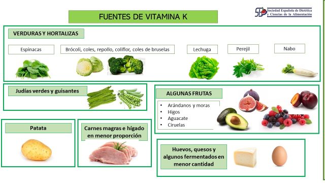 La vitamina K también se denomina filoquinona (K1) o menaquinona (K2) en función de su composición química, y se considera la vitamina antihemorrágica, ya que su déficit puede afectar a la coagulación y aumentar el riesgo de sangrado excesivo. La filoquinona es la que recibimos de forma más abundante por la dieta y procede de alimentos vegetales. De hecho, la mayor parte de la vitamina K la obtenemos de verduras y hortalizas de hoja verde o la co, brócoli, repollo… La menaquinona (menaquinona-4 y menaquinona-7) la encontramos en menores cantidades y procede de fuentes animales principalmente.